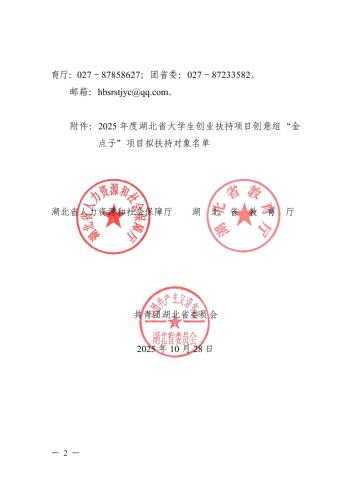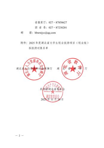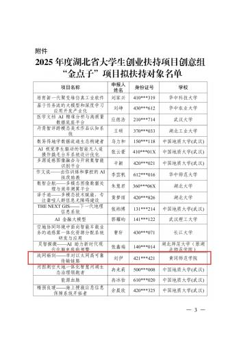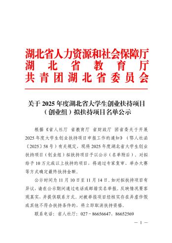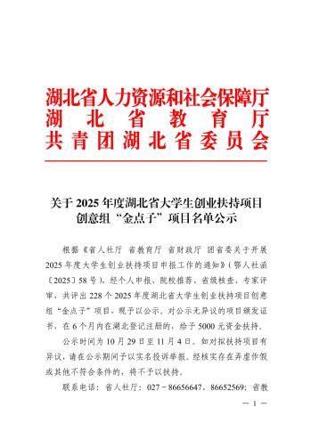 近日,湖北省人力资源和社会保障厅、湖北省教育厅与共青团湖北省委员会联合发布了《2025年度湖北省大学生创业扶持项目(创业组)拟扶持项目名单的公示》,我校4名大学生创业项目成功入选,共获20万元省级创业扶持资金。在同时发布的《2025 年度湖北省大学生创业扶持项目创意组“金点子”项目名单公示》中,我校1名学生的项目也榜上有名。